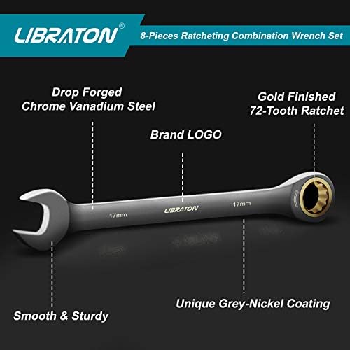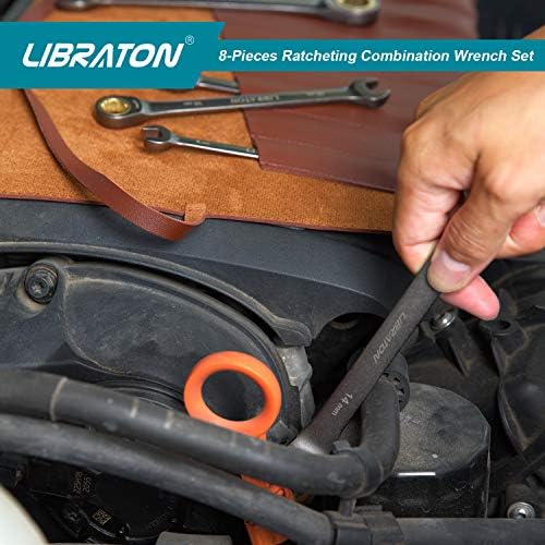LIBRATON Ratschenschlüssel 8tlg, Ratschenschlüsselset 8-19mm, Maul-Ringschlüssel-Satz, Schraubenschlüssel Set, Maulschlüssel Set Cr-V mit Vernickelung inkl. Leder Organizer Beutel