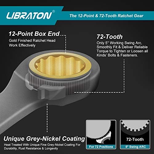 【Einzigartige Nickelbeschichtung】Die Schraubenschlüssel sind mit einer einzigartigen feinen Grau-Nickel-Beschichtung für Haltbarkeit, Rostbeständigkeit und Langlebigkeit wärmebehandelt. Das 12-Punkt- und 72-Zahn-Ratschengetriebe ist goldfarben und benötigen nur einen 5-Grad-Arbeitsschwenkbogen, passen reibungslos und liefern ein zuverlässiges Drehmoment, um die Schrauben und Befestigungselemente aller Art festzuziehen oder zu lösen.